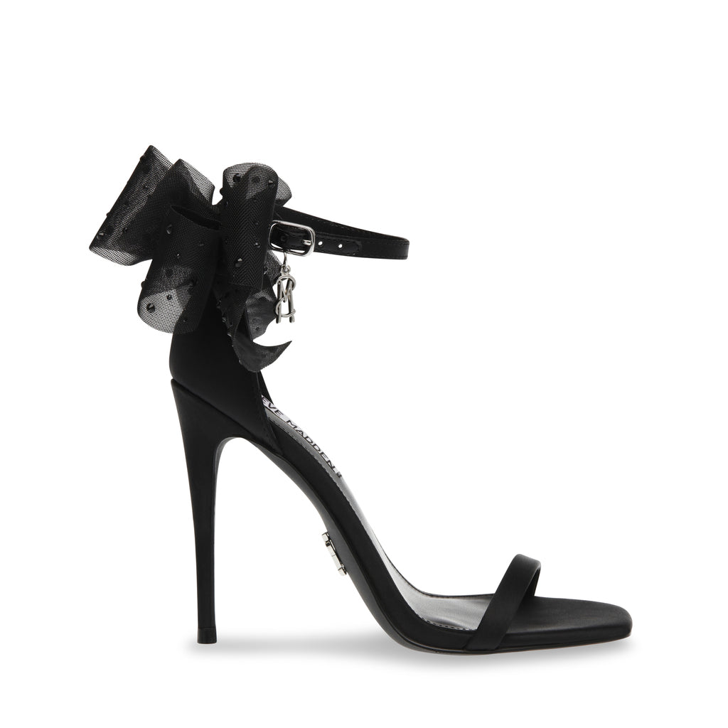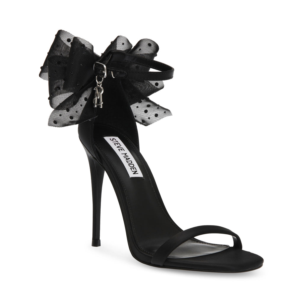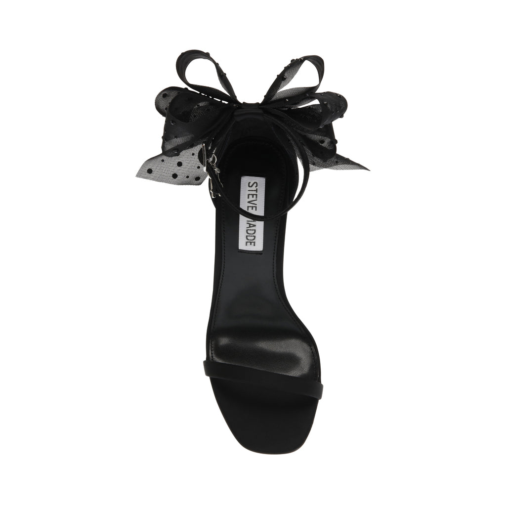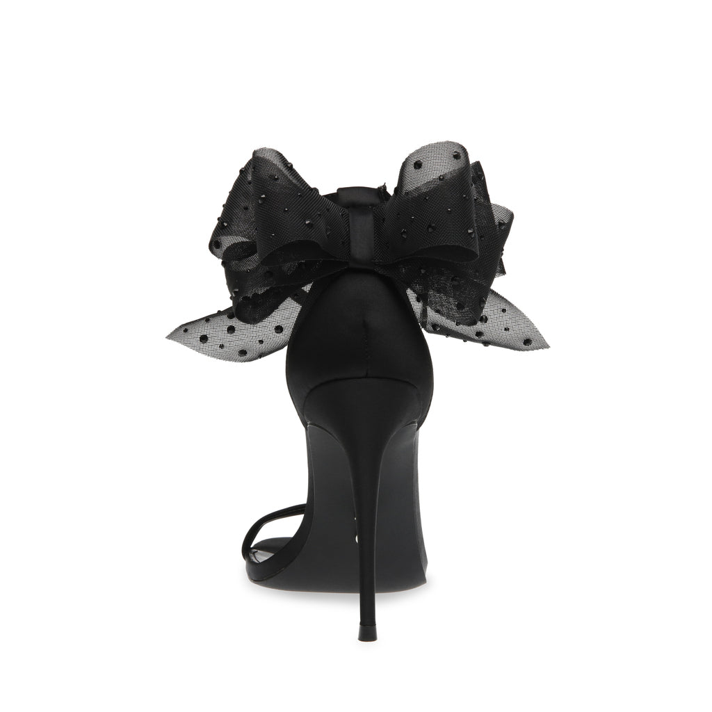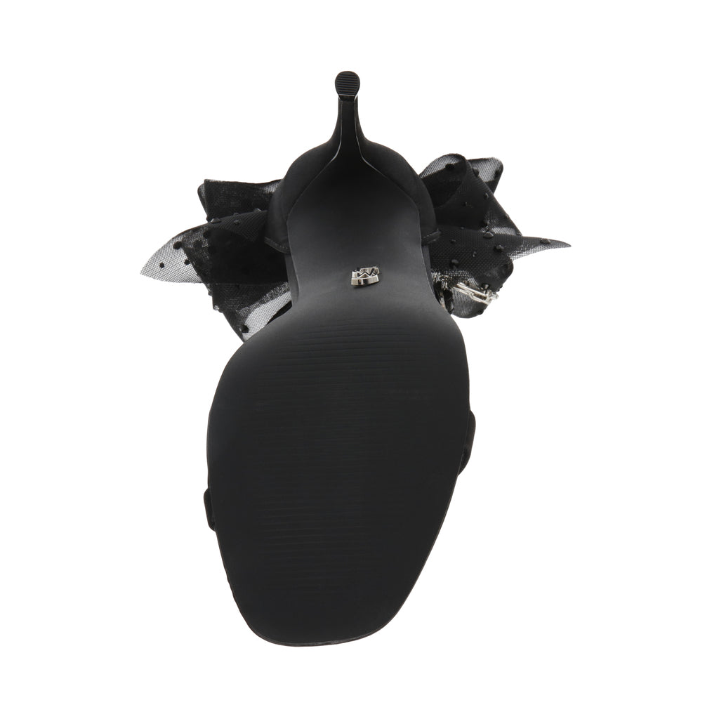 The NIKOLE sandal features a stiletto heel and a round toe, giving the design sleek lines that contrast with the voluminous bow at the back of the ankle.